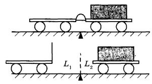 16 | Учитель провёл следующий опыт. Взял две одинаковые тележки, к одной из которых прикрепил лёгкую упругую стальную пластинку. Согнул эту пластинку и связал её ниткой, а вторую тележку, на которую поместил груз, приставил к первой так, чтобы она плотно соприкасалась с другим концом пластинки. После пережигания нити пружина выпрямилась, и обе тележки разъехались на разные расстояния (см. рисунок).