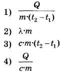 2 | Установите соответствие между названиями физических величин и формулами для расчёта этих величин. В формулах использованы обозначения: t — температура; Q — количество теплоты; m — масса тела; c — удельная теплоёмкость тела; λ — удельная теплота плавления.