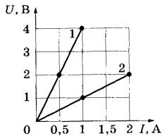 8 | На рисунке показаны два графика зависимости напряжения U на концах двух проводников — 1 и 2 -от силы тока I в них. Чему равно электрическое сопротивление второго проводника?