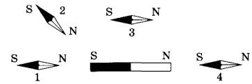 9 | В плоскости вокруг постоянного полосового магнита расположены магнитные стрелки (1-4) (см. рисунок). Для какой стрелки её расположение не соответствует указанным полюсам?