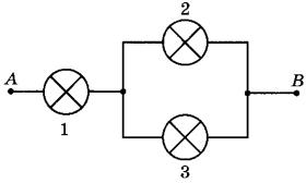25 | Клеммы А и В участка цепи, состоящего из трёх одинаковых ламп, подключены к батарее гальванических элементов. Во сколько раз изменится общая потребляемая мощность участка цепи, если лампа 3 перегорит?