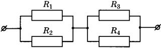 8 | Чему равно общее сопротивление участка цепи, изображённого на рисунке, если R1 = 8 Ом, R2 = 8 Ом, R3 = 10 Ом, R4 = 10 Ом?