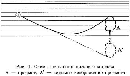 Нижние миражи возникают преимущественно в тех случаях, когда слои воздуха у поверхности Земли (например, в пустыне) очень сильно разогреты и их плотность становится аномально низкой. Лучи света, которые исходят от предметов, начинают преломляться и сильно искривляться. Они описывают дугу у поверхности и идут снизу вверх. В таком случае можно увидеть предметы как будто зеркально отражёнными в воде, а на самом деле это перевёрнутые изображения отдалённых объектов (рис. 1). А мнимое изображение неба создаёт при этом иллюзию воды на поверхности.
