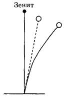 Рис. 3. Криволинейное распространение светового луча в атмосфере (сплошная линия) и кажущееся смещение объекта (пунктирная линия)