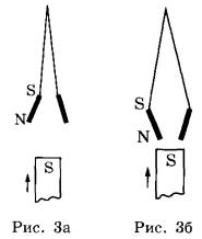 В своей работе Гильберт рассмотрел также различные способы намагничивания железа. Рассмотрим опыт, обнаруживающий «магнетизм через влияние». Подвесим на нитках две железные полоски параллельно друг другу и будем медленно подносить к ним большой постоянный магнит. При этом нижние концы полосок расходятся, так как намагничиваются одинаково (рис. 3а). При дальнейшем приближении магнита нижние концы полосок несколько сходятся, так как притяжение полосок к магниту становится больше, чем отталкивание полосок друг от друга (рис. 3б).