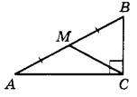 Известно, что вокруг прямоугольного треугольника можно описать окружность и его гипотенуза будет лежать на диаметре этой окружности. Точка M – центр окружности, а отрезки AM=MB=MC=R – ее радиусы. Отсюда имеем, что: