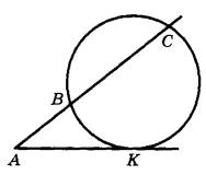 Задание 16. Через точку А, лежащую вне окружности, проведены две прямые. Одна прямая касается окружности в точке К. Другая прямая пересекает окружность в точках В и С, причём АВ = 4, ВС = 12. Найдите АК.