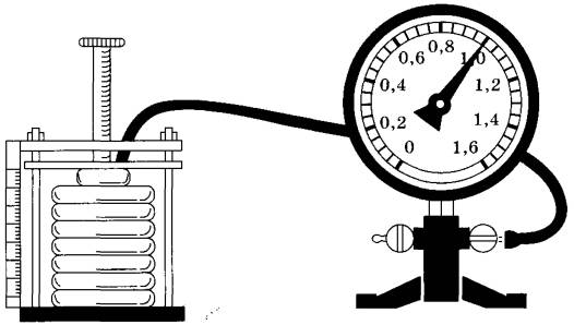 В закрытом гофрированном цилиндре переменного объёма (сильфоне) находится воздух при комнатной температуре. С помощью манометра измеряется давление воздуха в сильфоне (см. рисунок).
