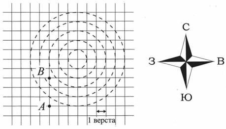 Задание 12. Пират нашёл старую карту, на которой написано, где зарыт клад. Чтобы добраться до клада, нужно из точки В пройти 3 версты на восток, 2 на север и 4 на северо-восток. Пират находится в точке А. Он хочет сначала дойти по прямой до точки B, а дальше идти по указаниям.
